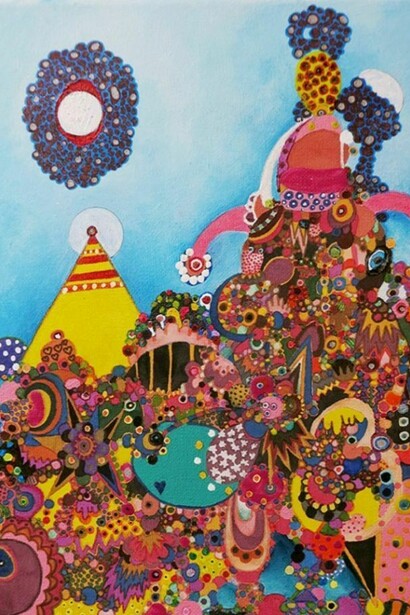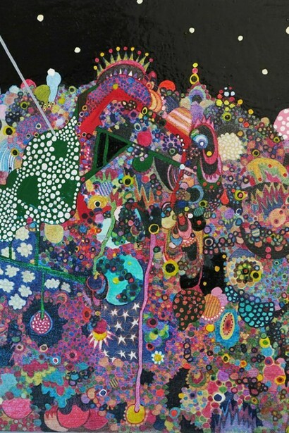 You are surrounded by colour, vivid photographs, vibrant canvases and shiny, copper sculpture. And then, amongst this sea of visual stimulation, there is non colour, pastel and cream working their way in, as arresting as their neighbours for their sheer contrast. Symbols and shapes vie with each other for your attention – some obscured, others arresting, and yet more hidden in plain sight. Kristin Hjellegjerde Gallery is pleased to present Arcana, a group show bringing together the works of Gemma Nelson, Martine Poppe and Amy Stephens. Running from 14 February – 16 March 2014, the exhibition also draws on the mystic origins of the word ‘arcana’ as a celebration of secrets and mysteries and a reflection upon positive spiritual sensitivity. Imagine the scene: a lonely fair ground waits patiently in the night, the word ‘Baloonride’ (sic), lighting up the surrounding desert darkness like a soft beacon of memories and days gone by. Nearby, a tondo painted in vibrant inks is witness to intricate shapes, a myriad colours and forms blooming across the canvas, stretching out and multiplying to create a psychedelic universe. Hanging in contrast to these bursts of colour are soft, hazy portraits, representational paintings that play on diversity and repetition – the images within them serene, abstracted, floating behind milky veils of paint. While different in style, medium and execution, the works are brought together by a unifying sense of spirituality as well as the notion of the revealed and concealed, of portals and the mystical.