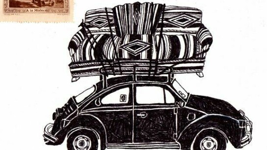 Vicki Behm views fragments of daily life in detail, noting idiosyncrasies and ironies with warmth and gentle mirth. In her second solo exhibition at 440 Gallery, New Drawings: Mexico and New York City, Behm presents her latest set of lively black ink drawings on hand made paper and collages. Her works comprise images she encounters in her hometown of New York City and Oaxaca, Mexico, where she spends her summers: old bicycles, Volkswagen beetles, antique typewriters, denizens of Union Square Park, neighborhood cafés, plates of tarts, cheese displays, bottles of tequila, cowboy boots at a flea market. She incorporates labels from food packages and bottles, and 1920s postage stamps from Oaxaca. The drawings have a flattened and tilted perspective; the negative space competing for interest with the subject. Behm demonstrates an expressive line quality and lyrical style. The inclusion of incidental components reflects a meticulous attention to her surroundings, while keeping a light playfulness at the heart of each image.