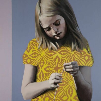 Claerwen James, born in 1970, originally trained as a molecular biologist at Oxford University and Cold Spring Harbor, NY. She graduated from the Slade School of Fine Art in 2003, and has won various awards, most notably the Slade School's own Melvill Nettleship Prize for Figure Composition. Introduced to Flowers gallery by Andrew Stahl as part of our Artist of the Day programme in 2004, she has gone on to have numerous solo exhibitions both here in the UK and the US. All of the portraits originated as photographs: some scavenged, some taken by the artist, who believes that the awkwardness of the photographic moment is crucial to the painful, elegiac quality of the paintings. Among the images used are those from Claerwen James' own childhood. In 2006, Francis Spufford wrote that Claerwen James' subject matter is, in a sense, the photographic moment when a point in time is snatched from the flow, "sealed into stillness and set in strange relationship to the continued life... which we do not see in photographs but which they always imply, giving the medium its mortal edge."