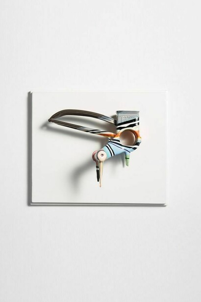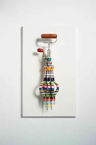 - Shane Bradford, Wonder Whisk, 49.5 x 29.5 x 14 cm (framed), Household gloss paint, metallic emulsion on kitchen whisk, 2013