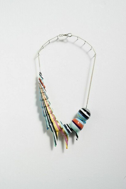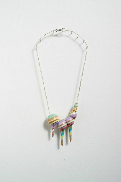 - Shane Bradford, Oyster Necklace, 16 x 10 x 3 cm, Household gloss paint, metallic emulsion, beads, on silver chain, 2013