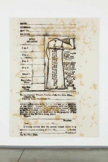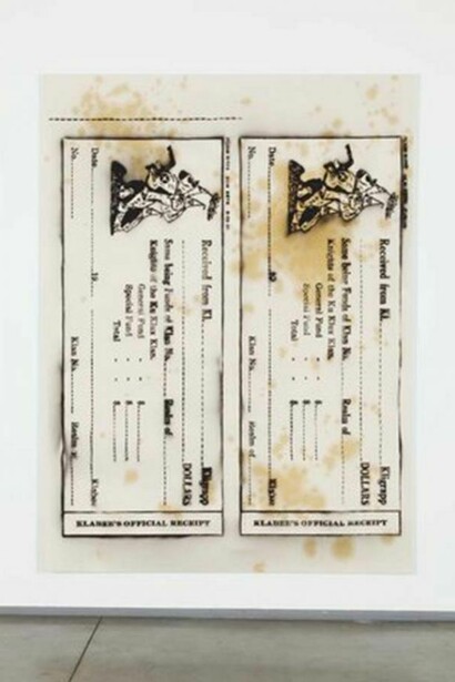 These are history paintings, in the literal sense that they recreate actual historical documents. They are statements of facts, providing information rather than adopting a particular stance. In this regard, they take a cue from Gerhard Richter’s October 18, 1977, his cycle of painterly reproductions of photographs taken of the extreme leftist Red Army Faction after their arrest. Like the RAF works, the Klan paintings avoid censuring or supporting their subjects, leaving any such judgment entirely to the viewer.
