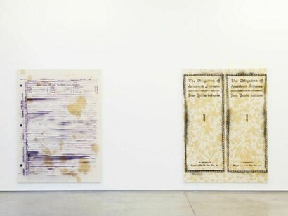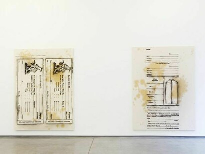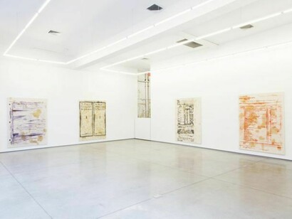 The exhibition is streamlined, both visually and in its subject matter, precluding any excess content or distraction. The paintings share a common scale of 84 by 62 inches, while the color palettes are limited, individual works using only a single shade of paint. The backgrounds consist of raw canvas covered in yellow grease stains. These oily blotches seem familiar, but whether they recall the discarded wax paper of a fast-food hamburger, or actionist paintings, or something else altogether cannot be said.