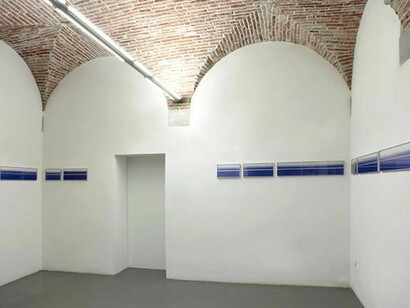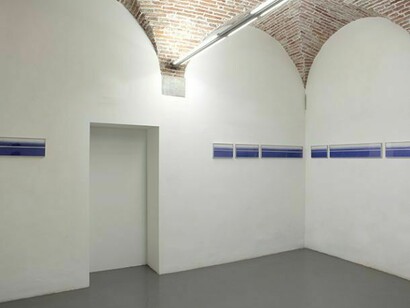 “The spatial project of Horizont is based on the extreme tension of the luminous band as a revelation of an interior path, concentrated not only on the sequence of the different lengths of the diptychs but above all on the imaginative opportunities that go beyond the ascertain-able trajectory. In the calibrated construction of Horizont various factors come into play: the dimension of each diptych in relation to the whole; the above and the below as a genesis of the horizon itself; the regular distance between the perimeters of each single surface; the quantity of voids compared to the quality of the signs.