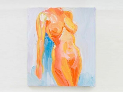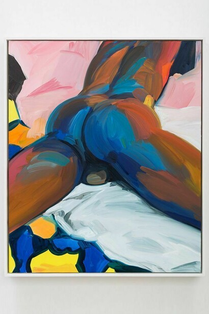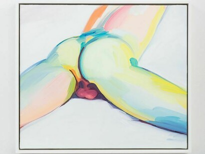 Celia Hempton paints small canvases, of friends and models (some sourced on the internet in video chat-rooms) focusing on what used to be called “private parts”. She hangs these intimate images on large wall paintings that reference landscapes, with sensuous veils of colour and mist cascading down the wall.