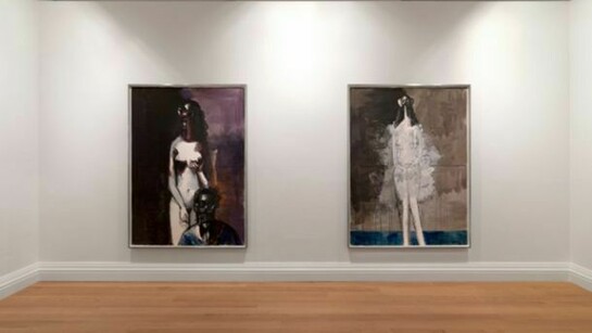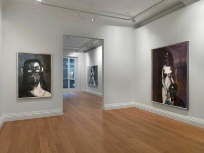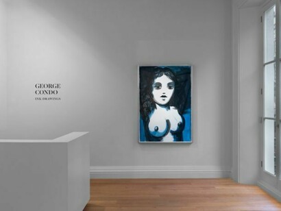 Following his pivotal exhibition of Drawing Paintings at Skarstedt New York in 2011, Condo has explored the relationship between the directness of drawing and the controlled methods of painting. The new works on paper are characterised by a dark brooding palette and a return to the figurative in subject matter. Marking a deliberate move away from the abstract tendencies of previous work, this series heralds the beginning of a new stylistic engagement with a traditional subject in which the drama of the works is intensified by their impressive scale. In Standing Bather, 2013 the female nude positioned centre of the composition embodies an angelic purity against the tempestuous background of dark browns and black. Through his elongation of the female form to grand dimensions and his application of gesso onto the paper, Condo imbues the figure with a sculptural quality and magnifies her figurative presence. Here as in other works in the series, the wash of colour dripping down the surface of the paper underscores the gestural freedom and spontaneity of drawing which Condo has embraced in this new body of work.