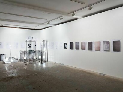 As the whole exhibition with the photos from stories is relating often to memories of houses, particularly childhood house fantasies; the space of the gallery, although decorated with the text posters and the photographs appears very empty, but is immaterially somehow loaded with imagination of rooms and memories. This emptiness is only partly occupied by a little extra space, more a sculptural space than a room defined by a work that continues and alternates the older lamp practice of the artist. This enclosed space contains space dividing objects turned into lamps, beating fences into lamps.