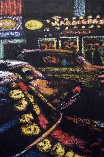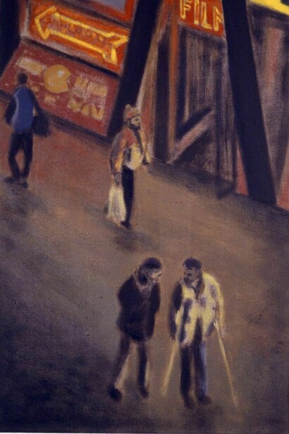 Jane Dickson, is known for her paintings of Times Square in the eighties, where she lived with her husband, the filmmaker, Charlie Ahearn, painting the neon light of bars and strip clubs. Glenn O’Brien wrote “Dickson’s transcendental reportage updates realism with the full blown post-modern spectrum of artificial light. The sun never intrudes on Dickson’s pictures. This is a world of endless night, where black light is the beacon of the black hole of desire.”