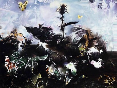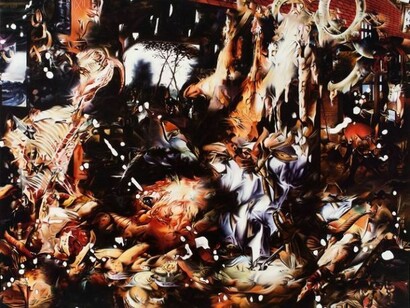 In The Flight into Egypt (based on Pieter Aertsen’s Butcher’s Stall), the eye of a cow stares out from a lumpy fog of animal parts. The elements in the painting battle for attention and destroy the original composition. The piece refuses narrative, and it favors fragments over the whole.