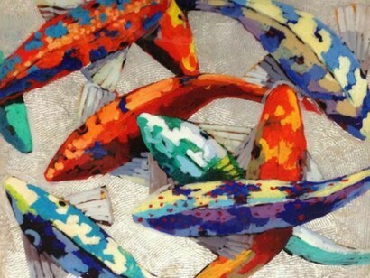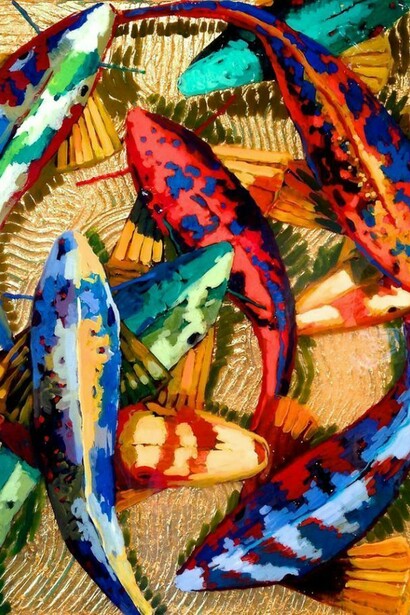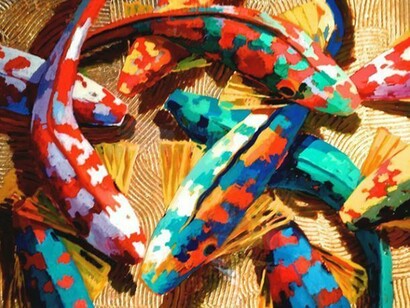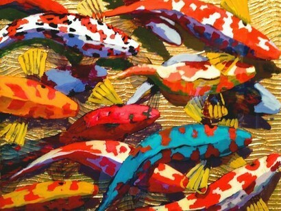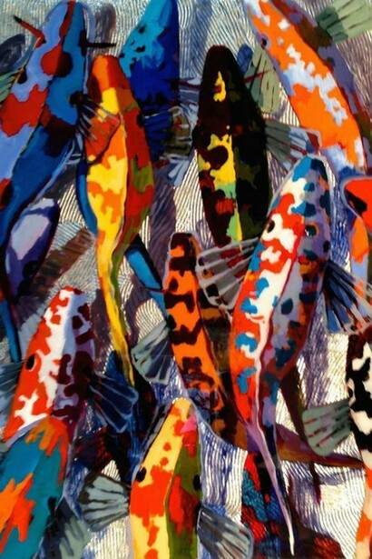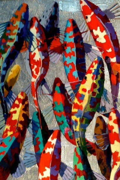 Hyder is a master of one of the oldest techniques of making images - woodcut. Creating undulating forms on which to transpose his koi fish, he mirrors the rhythmic beauty of the natural world in his compositions. Using layer upon layer of metal leaf and resin, Hyder's paintings shimmer with radiance and energy. Having recently broadened his koi series to include large, illuminated installation pieces, Hyder pushes his work into the realm of interactive art. Each luminary features a myriad of colored lighting options and time lapses, creating space for individual aesthetic, emotional, and intellectual contemplation.