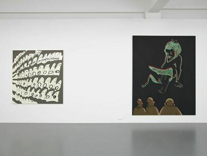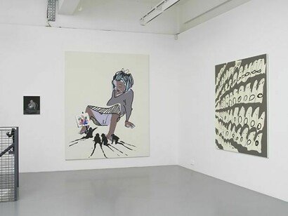 Abstract Pussy (2013) and 3D Pussy (2013) form two central paintings to Madani’s exhibition. Both feature a highly illustrated young girl whose silkscreened image dominates both the space and Madani’s men who occupy it with her. In Abstract Pussy the shadowy, loosely painted men huddle under the girl’s skirt—looking and crawling towards the purple light emanating underneath. One man guides the others on their inspection wielding a Kandinsky-esque abstract painting sign. 3D Pussy pushes the linear illustrative qualities of the girl from Abstract Pussy one step further. The girl is structured more as an image through the play on 3D lines, and she is considerably separated from the men taking a commanding position in front of them. The relationship between the girl and the men, watching her through the mediation of 3D glasses, plays on the intangibility of painting and the desire for the things depicted to become three-dimensional.