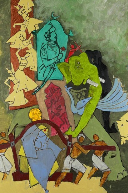 M.F. Husain is regarded as one of the leaders of the modern art movement in Indian painting. Born in Pandharpur, his early years were spent in Indore. Husain began his career as a painter of cinema hoardings after attending art school in Bombay (now Mumbai). Using freehand drawing and vibrant colour, he depicted Indian subject matter in the style of contemporary European art movements, particularly Cubism.