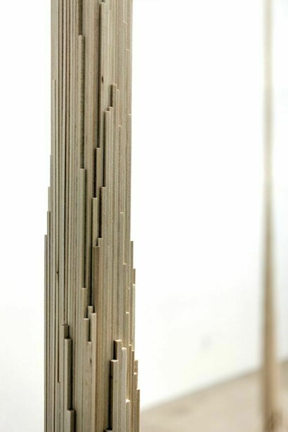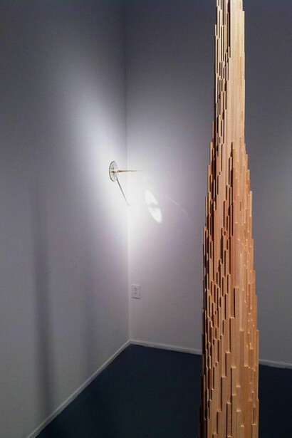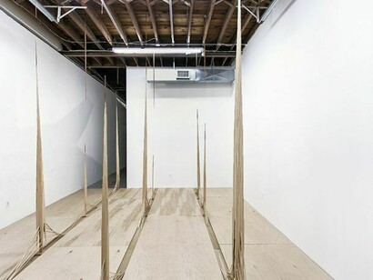 Locust Projects is pleased to present A Fabricated Field, a new installation by Miami-based artist Felice Grodin. Trained as an architect, Grodin situates her artistic practice within the realm of geophilosophy - a field of thought that considers the formations between territories. For her installation, Grodin will fabricate a raised sub-floor encompassing the entirety of the project room. Gaps between the standard 4’x8’ grid of plywood sheets allow for another system to emerge. Bundles of wooden sticks rise at irregular intervals, both subverting the grid and binding it together like mycelium to create an all-encompassing installation.