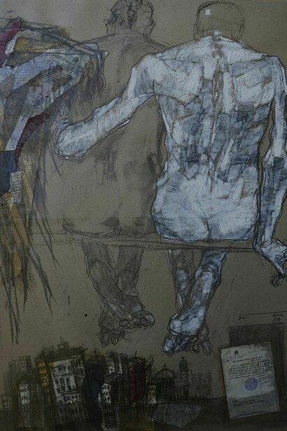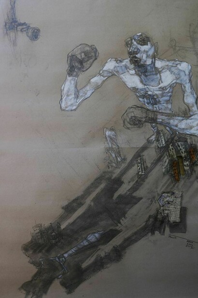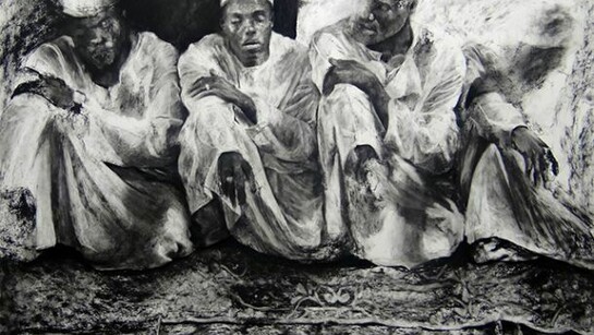 The series of large charcoal drawings that Phoebe Boswell has created for the exhibition has been inspired by the Maulidi ya Homu of Zanzibar. A Sufi tradition of rhythmic chanting with origins in the Middle East, it was brought to East Africa through the region’s trade routes. This form of Maulidi now only exists in the Zanzibar Archipelago. While the chants were originally prayers to the Prophet, it has since become a cultural, rather than a religious, appropriation, its rhythmic movements echoing the waves and sailboats of the East African coast. “I became interested in the fact that this tradition only exists in Zanzibar, and in the notion of how the sharing, appropriating, and colonising of culture works,” explains Boswell. “I'm also fascinated by the idea of shared systems of belief, and this to me represents a physical manifestation of that.” As with much of her practice, these works have been in part inspired by Boswell’s own intercultural background, growing up in the Middle East as the child of Kenyan-British parents. “I appreciate the multi-layered nature of post-global upbringings such as my own,” she says, “and want to determine ways of exploring and conveying these multi-faceted narratives through my work, where a single drawing or a single screen film is not enough.” The works are created in charcoal, carbon, and graphite, through Boswell’s process of heavy layering and subsequent rubbing away of the medium – a reflection of the rhythmic nature of the ritual itself. “Like memory of an experience, or culture itself, [it] is revelatory in waves – the image comes and goes until completion,” she says. “It's about ritual, and the coming together to engage in a spiritually uplifting act.”