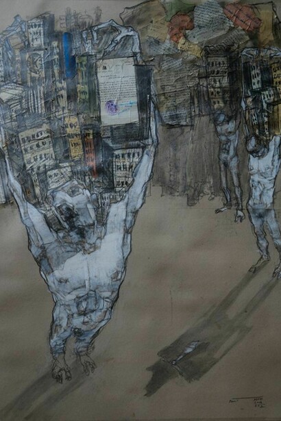 The work of Ethiopian artist Dawit Abebe examines belief systems, the search for knowledge, privacy, alienation, and materiality. Above all, he is interested in the impact of technology on human behaviour, as well as the impact of these technologies on the environment. In a sense, Abebe’s practice probes the realm of our shared cultural and belief systems, with technology taking on the role of an ‘other’ culture. “My interest in this subject has been a gradual process of examination of people’s lives over the last ten years,” he explains. Abebe began to notice how social interaction has begun to move out of the public sphere and into the technological one, through computers and mobile phones, and it is this that he explores here with a series of paintings. “I’ve seen the decrease of the ‘face to face’ social aspect,” he says. “How do these technologies affect our social life? What happens when we meet less frequently with ‘real’ people, and more often online?” Abebe also examines the impact of technology on societies, and how their introduction causes them to evolve differently. “In rural places, such as Ethiopia, Madagascar, or Kenya, people use technology as a sign of wealth, such as owning a television. They adapt fast to new technologies, and their behaviour changes fast too.”