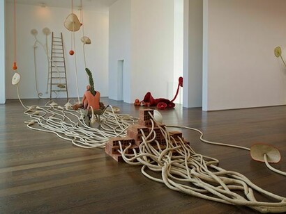 Trans draws inspiration from the common linguistic prefix and its associated range of references: 'trans-' actions such as transgressing, transforming and transmuting. The interelated series of sculptural installations that make up the exhibition are designed to intensify the relationship between the viewer, the work and the surrounding architecture. Pre-existing elements such as bricks, industrial piping and even the gallery walls merge with the organic forms of the sculptures, made of hand-sewn ropes, beads and woven straw. The crossing and interlacing of materials express a desire for spatial expansion beyond the physical confines of the gallery.