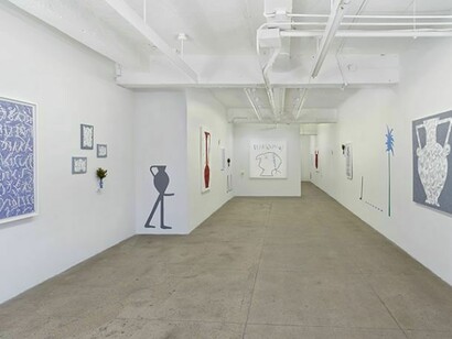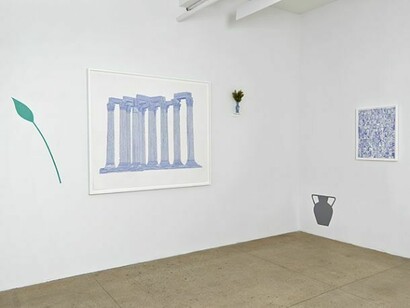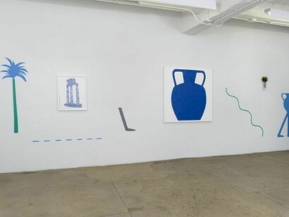 Pastiche Cicero is an aesthetic field trip undergoing an archeological dig. Featuring lyrical and graphic motifs from antiquity and the contemporary, the exhibition is comprised of new highly textured oil paintings; densely detailed blue gel pen drawings; bold, colorful minimal wall murals; and readymade sculptural elements.