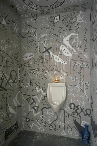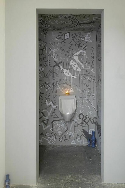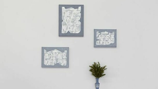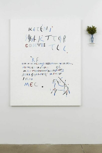 Hull's source material is the written detritus of disregarded, disintegrated wall graffiti, ruins, incidental letters and pictures from the walls of Pompeii and the Athenian Agora. This visual vocabulary evidences the entropy of language with work that is conservative and subversive, Classical yet cheeky.