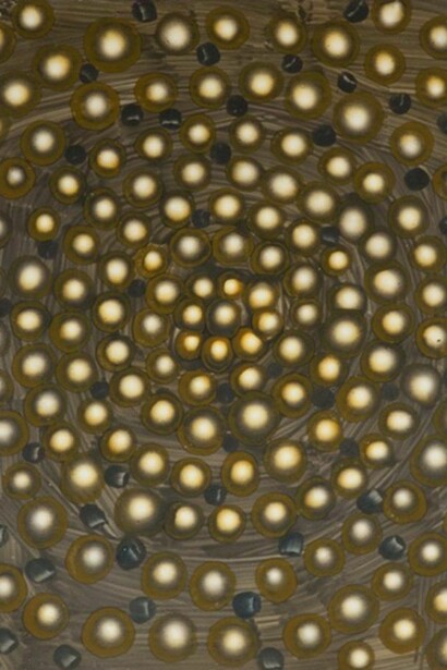 Barbara Takenaga’s paintings use packed, detailed repetition of dots and grids overlaid with washes and punctuated by irregularities, to create radiating, undulating constellations. They suggest cellular and cosmic forms, the underwater world, and outer space. Takenaga has been a professor at Williams College since 1985.