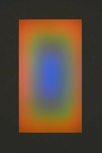Also displayed in the exhibition are two works from the Tall Glass series: Sojourn (2006), presented in the downstairs gallery between the two Wide Glass works, and Sensing Thought (2005), upstairs. Each piece from this series is constructed to create a tangible and physical plane of light. The artist has likened the processional development of colours to a musical system utilising themes and gradient tones. The physical construction of these work srelates to the earlier series entitled Shallow Space Constructions from the late 1960s and early 1970s.