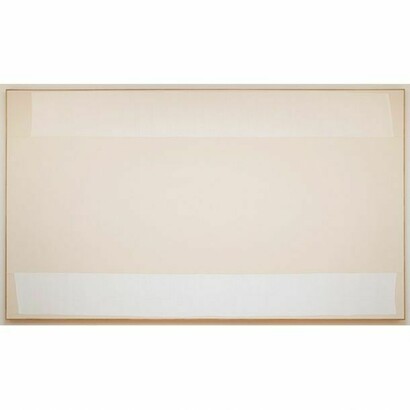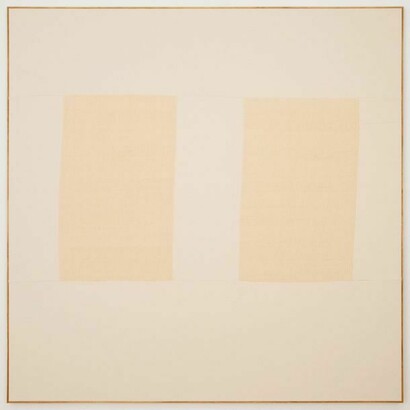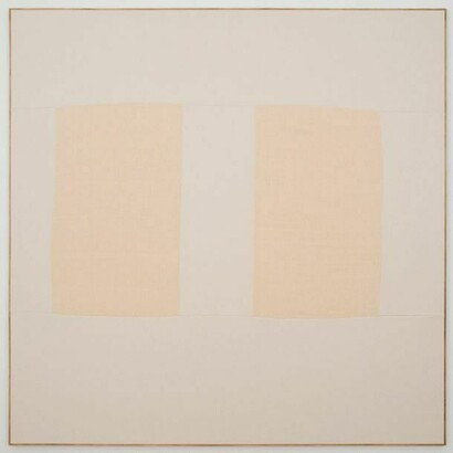 With a modest economy of gesture and form, Cook allows mutations to be traceable. In hand woven passages, produced on a loom, stitches grow subtly off-register, pulling and distorting the performance of a tidy pattern. The incongruity of textures, seams, and fibers becomes the content of the work, while the nuance of beige, white, and peach geometric shapes pushing in and out of positive and negative formal space usher the work into an aesthetically sharp dialogue with late-modernist traditions of painting and structural/materialist devices of deconstruction. Cook’s rectangular forms-so wedded to these discourses and their acknowledgement of the boundaries of the picture plane-tug and waver, allowing those boundaries to bleed and warp.