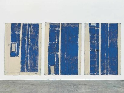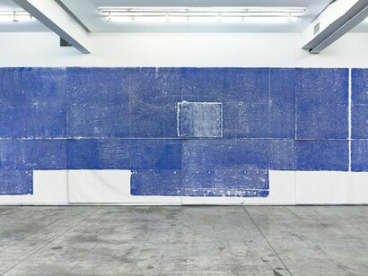 Jennifer Bornstein printed the gallery space. This doesn't mean metaphorically but literally and physically. Monotype prints were pulled from the floor, window, ceiling beams, heating vents, and cracks under the walls. To do this, the architectural elements in the room (doors, beams, etc.) were rolled with oil-based printing inks and images pulled from their surfaces. The footprint of the 30' x 40' gallery floor was jack-hammered with a line running north to south, then inked up like a printing plate and printed using oil-based ink.