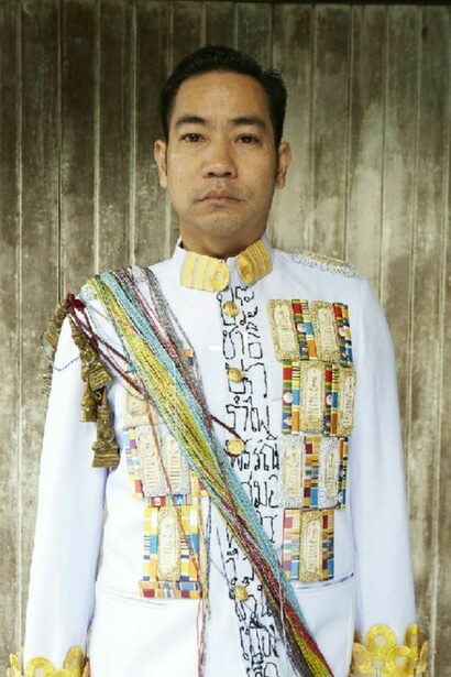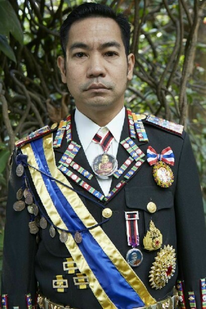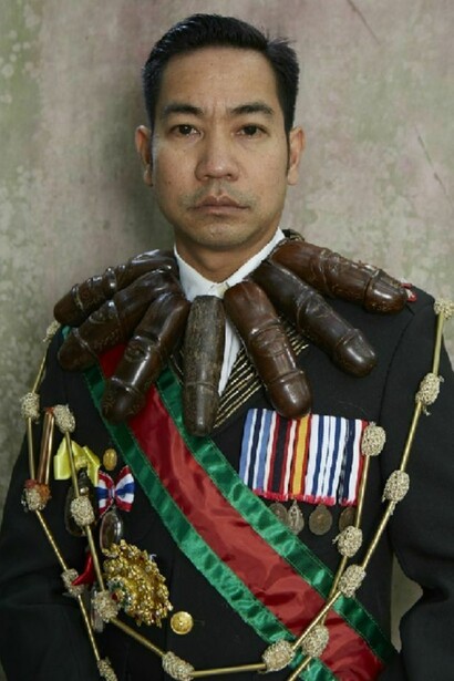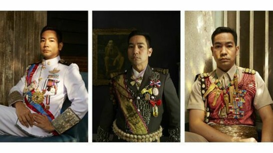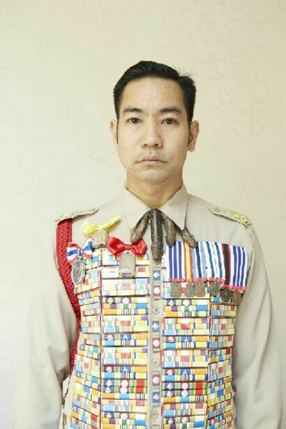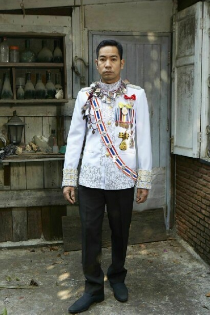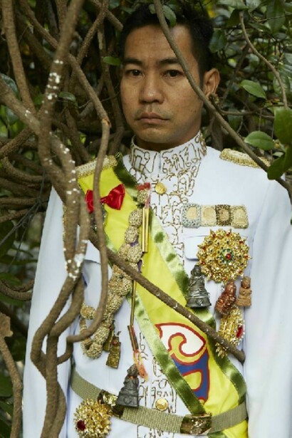 The exhibition is a meditation on the transience of worldly success and the way the trappings of social status are often imbued with quasi-mystical associations that maintain a link with animistic beliefs. With the photographs, Jakkai adopts poses taken from portraits of his ancestors, many of whom served as royal courtiers and in some cases had their lives cut short by the sometimes tragic vicissitudes of Thai political history. Wearing Thai civil service uniforms decked out with awards, he evokes the type of formal portrait photographs that are included in the funeral books that Thai families compile to commemorate the lives of relatives, and that typically emphasize the deceased person’s social status. Jakkai has encrusted the actual uniforms with elaborate ornaments that are inspired by Buddhist amulets and animist talismans, hinting at the deep-seated beliefs that underlie current social conventions. With some of the portraits, Jakkai poses in front of dilapidated backgrounds, pointing to the process of decay and rebirth that alludes to the cycle of life and death, as well as perhaps the state of social breakdown in today’s fractious Thailand. The exhibition title itself suggests that social status, like everything else in life, is but a transitory phase. This sense is heighted by the short video work, in which a uniform jacket slowly moves under flowing water, accompanied by a soundtrack of a burning funeral pyre.