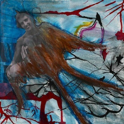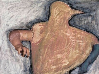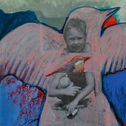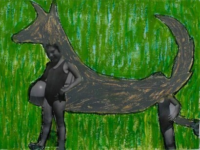 The painting that marks Gibbons' pivotal foray into this series is a tribute to her late cousin. It depicts a large white horse superimposed on a house. The artist mixes photographic collage with layers of transparent acrylic paint to create a shifting, ghostlike impression. Her practice of incorporating found objects and painting over found canvases introduces the elements of chance and discovery into the work. In this series, Gibbons has used enlarged prints of old family photographs, mingling memory and emotion with the surreal and mystical. The animals - birds, horses, dogs - in all the works are symbolic, but they also refer to actual events in the artist's life. The horse is more than a mythological symbol of freedom or passage to another world, it is the animal that fascinated and carried the artist and her cousin on its back in their childhood.