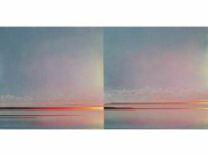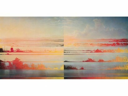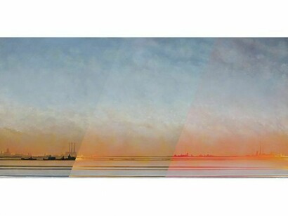 Innerst also paints panoramic vistas of rivers and estuaries, atmospheric landscapes intersected by prismatic hues that create bold visual effects. By emphasizing the refraction of light in these luminous environments, some of which include industrial buildings on a low horizon in the distance, he invites us to reflect on the interplay between an idealized landscape and the modern world.