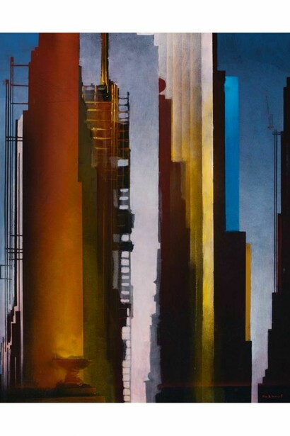 Mark Innerst is a painter who transforms the urban and rural landscape, investing it with a radiant beauty and complexity. Cities like New York and Philadelphia can simultaneously appear majestic, immense, and serene, as streetscapes become a series of soaring verticals or stacked, layered blocks of color. Buildings curve overhead or sweep downward to street level, where human activity is reduced to blurs of light and movement.