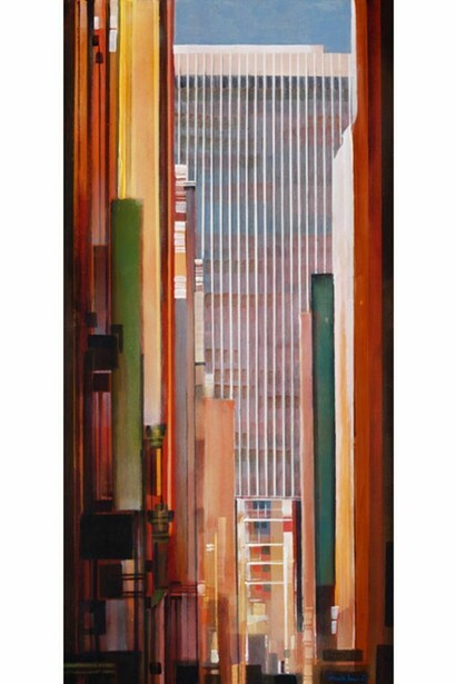 In his new Midtown series, inspired in large part by the towers that line Manhattan’s Sixth Avenue in the forties and fifties, as well as in his paintings of downtown Philadelphia, Innerst reduces architecture to abstracted elements, stripes and geometric shapes, that recede in rhythmic progressions to either an opening at the end of an urban canyon or the façade of another building, closing the view in upon itself.