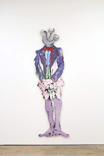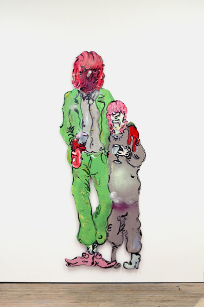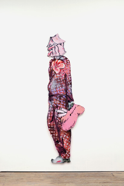 ‘The Plumbers’ is a new series of paintings produced over the past year, in which the artist carves life-size figures from plywood then in his signature style, using household acrylic paint; he brings a spectrum of characters to life. A tribe of plumbers with names and individual characters, waiting to enter centre stage. Concomitantly each one is a self-portrait of a young man in all his contemporary guises. These works are also the first series to incorporate collage within the paint; eyes, pearl earrings and clothing embellishments.