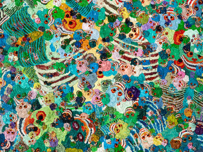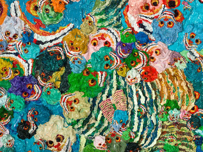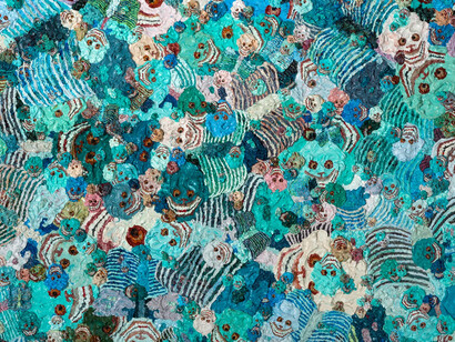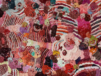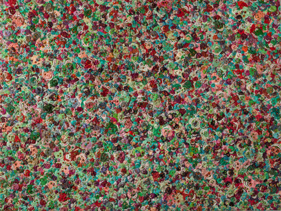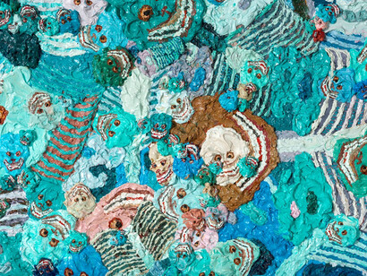 Employing an almost pointillist technique, Zhang Huan’s application of the thick pigment performs an optical illusion. From a distance, the canvas metamorphoses into a field of psychedelic colours; the pink, teal, lilac and cornflower blue palette appears to pulsate with energy. Upon closer inspection, the colours separate and the individual faces of the skulls emerge from their abstraction. Seemingly uncontrolled and haphazard, the placement of the skulls on the canvas is misleading.