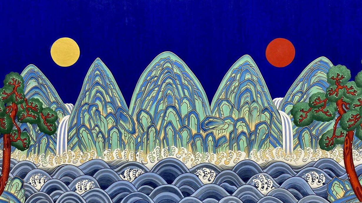 In complement to these two works, other pieces have a strongly sing-song quality, as if to propose, in the midst of the ongoing argumentation, a moment of common celebration. Here, the painting of Kate Oh' The sun, moon and five peaks stands out in its lush color show of a mountainous landscape. The perspective is frontal, flattened, speaking almost directly to the viewer like an enthusiastic tour-guide. This direct engagement beckons the viewer into a shared experience, a moment of collective admiration. The opulent hues, resplendent and inviting, evoke a sense of harmony and equilibrium, mirroring the appeal of the natural world and the cultural home of Korea.