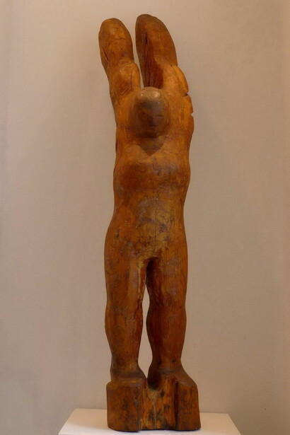 The exhibition comprises also by drawings by the self-taught sculptor Panos Raimondos. Most were executed during the artist’s time in Paris and are the only ones to survive. They present dozens of angelic figures drawn with ballpoint pen on newspaper sheets. All but one of the works was made on copies of Le Monde, and the other one on a sheet of the Greek newspaper Acropolis. The drawings span almost a decade, the first dating from October 17, 1972 and the latest from October 2, 1981, by which time the artist had moved permanently to Athens. Raimondos’ drawings are accompanied by a series of wood carvings, with their juxtaposition aiming to promote the viewers’ understanding of the artist’s vision—a vision in which childishness and an unaffected simplicity have a key role.