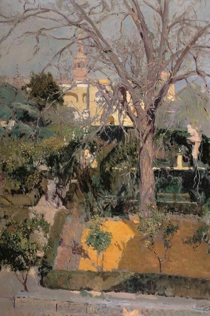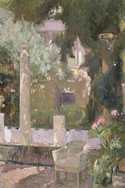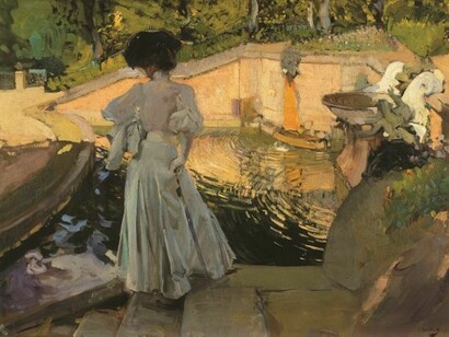 Andalusia profoundly changed Sorolla’s work, leading to a style that culminated in the paintings inspired by the garden of his new house in Madrid. The elderly painter spent a lot of energy creating his garden, with a passion that is reminiscent of Monet and his lily pond. He took his inspiration from the verdant corners of Seville and Grenada, bringing from Andalusia fountains, tiles, columns, statues, fruit trees and ornamental plants. And like Monet at Giverny, Sorolla found in his garden an inexhaustible source of inspiration, transferring to the canvas the lessons of simplicity and lyricism he had acquired in Andalucía.