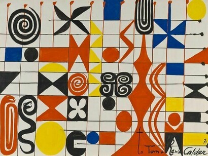 Alexander Calder (1898-1976) was born in Lawnton, Pennsylvania USA. Calder was “the first American of the twentieth century to win and hold a European reputation” (George Heard Hamilton). He traveled to Paris in 1926, where he soon became a close friend of Miró, with whom he was to share his formal humor, a preference for vegetal shapes, and expressive lines that drew patterns in space. In addition, a visit to the studio of Mondrian made an impact on his work. Like Mondrian, he limited his palette to primary colors and composed his works in lines and planes. Calder developed his visual language in three dimensions, and from the early 1930s, with his ‘mobiles’, caused his suspended sculptures to move in space. (Calder’s first portraits of acquaintances and sculptures in space were named mobiles by Marcel Duchamp because of their slow and continuous movement.)