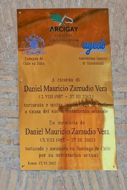 Una placa en italiano y en castellano donde se lee “En recuerdo de Daniel Zamudio Vera (3.VIII.1987 – 27.III.2012), torturado y asesinado en Santiago de Chile a causa de su orientación sexual” ) con los logotipos de Arcigay, Agedo, la asociación de familiares de homosexuales y de la Embajada chilena en Italia recordará al joven chileno de 24 años, convertido en icono de la lucha contra la homofobia y la transfobia, que fuera brutalmente asesinado a causa de su homosexualidad.