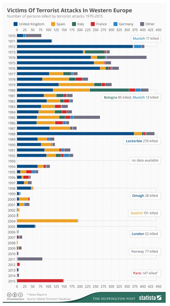 Además, parece haberse instalado otra paranoia adjunta a la anterior, que establece que estamos menos a salvo que hace años porque el terrorismo nos golpea en nuestras casas, y todo es por culpa de la inmigración. Sin embargo, como indica un gráfico elaborado por el Huffington Post, la reducción de ataques terroristas en la actualidad ha sido drástica con respecto a los años 70 y 80, donde la actuación del IRA, ETA, Brigatte Rosse o Baader-Meinhof, entre otros grupos, provocaban oleadas de ataques en Europa que resultaban en cifras de entre 250 y 400 muertos por año en combinación de los países europeos. Sin embargo, en los últimos años, sólo son destacables las grandes atrocidades de los atentados del 11-M en Madrid, del metro de Londres y los recientes de París, pero en ningún caso se sobrepasan los 200 muertos por año, y hay años donde la cifra se queda por debajo de 25 muertos por año, mientras que entre las décadas de los 70 y los 80, la cifra más baja por año es de 150. Sin embargo, en esos casos no se consideraba que la afinidad política o religiosa tuviese que conllevar que todos los defensores de las mismas fueran considerados terroristas y mereciesen permanecer en centros de detención por la simple condición de ser comunistas, nacionalistas o católicos. ¿Por qué ser musulmán o inmigrante sí debe serlo?