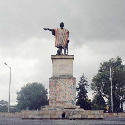 Le sigue la pieza Turistas: Isabel entregando un contrato y Cristóbal señalando hacia el sur (2012): fotografías de las esculturas de la Reina Isabel y Cristóbal Colón que se encuentran en la plaza “Monumento a los Reyes Católicos” en Bogotá, Colombia. En esta ocasión las esculturas visten “ruanas”, ponchos de la región de los Andes, una acción realizada junto con un grupo de personas con quienes Iván organizó una comunidad efímera en el marco del proyecto La Estrategia (detallada más abajo). El espacio urbano se convierte en un campo de batalla donde cualquier rincón puede ser contenedor de declaraciones.