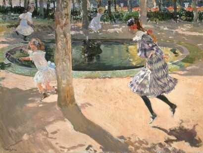 Abrirán la exposición una importante serie de retratos de la familia del pintor en jardines con fuentes del 1906-1907: obras maestras como María vestida de labradora valenciana, Saltando a la comba o Mirando los peces, en las cuales las figuras se funden en la atmósfera chispeante de pinceladas de color puro o dibujan sinuosas siluetas sobre luminosos espejos de agua, en un juego de analogías entre el sujeto y el paisaje que prefigura la modernidad de la ultima producción de Sorolla.