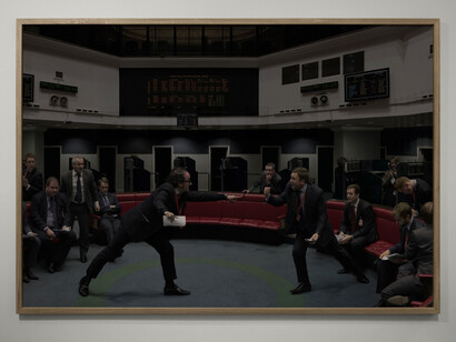 Ainsi, des quatre photographies réalisées dans le village indien, deux l’ont été dans les conditions classiques du documentaire, en prise directe sur le réel (Coal Gleaner, The Tree); une autre est la reconstitution d’une scène vue lors d’un précédent séjour (Father and Daughter); la dernière (Boys Fighting) est la création, avec des «acteurs», d’une situation imaginaire. Autre exemple, dans un univers bien différent, Trading Floor est une composition numérique faite à partir de clichés pris, sur le vif, à la bourse des métaux de Londres. Death of a Mercenary et House to House, réalisées en Libye pendant la guerre de 2011, s’apparentent, elles, plus aisément aux travaux antérieurs de l’artiste.