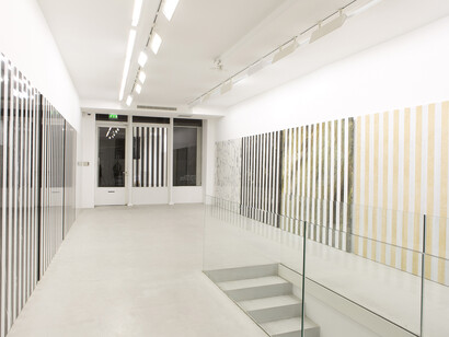 Avec « Au fur et à mesure, travaux in situ et situés », Daniel Buren apprécie, géométrise et arpente un lieu, l’espace de la rue du Pont de Lodi, où, en 1983, il avait déjà réalisé une exposition. La Galerie s’appelait alors Eric Fabre, « Auparavant » en était le titre. Elle fait aujourd’hui l’objet d’un clin d’oeil, d’une « entrée en matière », dans l’actuelle vitrine de la galerie kamel mennour, dont la forme ancienne n’a pas changé.
