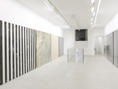 Marbre, pierre, granit et graphite sont les matériaux et les couleurs de la quatrième exposition personnelle de Daniel Buren à la galerie kamel mennour. « Au fur et à mesure, travaux in situ et situés », tel est le titre de cette nouvelle intervention de l’artiste français mondialement connu pour ses interprétations poétiques et ses subversions architecturales – éphémères ou durables – de lieux aussi bien publics que privés allant du centre Pompidou à Paris au musée Guggenheim de New York, et plus généralement en Europe, en Amérique du Nord et Amérique du Sud, en passant par Guadalajara et Mexico, ainsi qu’en Afrique et en Asie.