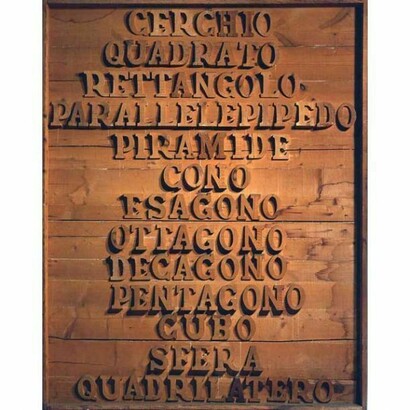 - Mario Ceroli, La geometria, quale paesaggio pittoresco, 1974, wood, letters on wood, 200 x 160 x 10 cm, Courtesy Tornabuoni Art