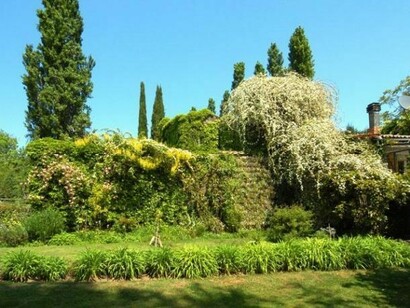Tre grandi cipressi centrali accolgono all’ingresso, introducendo verso un primo prato rotondeggiante e poi, a sinistra, verso una curva concava di pioppi impreziositi da ghirlande di Rosa banksiae. Dietro il triumvirato di cipressi, totalmente foderata di edera e glicine, la casa si allunga a destra congiungendosi alla prateria dopo aver doppiato un ponticello, raccordo di due lembi di terra attraversati dall'acqua. La campitura a prato si allarga ellittica verso il fondo, completata, nella cinta degli altofusti che delimita questa parte del paesaggio, dalla strada, dalla curva profonda e coloratissima del “mixed-border” di stagionali, e da perenni e arbustive in altezza crescente, ornamento anche dell'area da poco dedicata al bed&breakfast. Da qui un nuovo ponte traghetta al giardino posteriore, quello più legato al fiume e all’antica storia del sito.