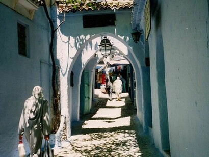 Dopo il colorito villaggio di Bab Taza, oltre la valle ci appare la splendida visione di Chefchaouen, città arroccata sulla parete orientale del monte Tisuka (2170 m). È ormai il tramonto quando seguiamo la ripidissima strada che dal centro conduce sopra la città, al Camping Azilan (5 euro), di fronte al grande Asmaa Hotel. Un campeggio tra il verde della montagna, frequentato prevalentemente da europei: qualche autocaravan, camper, furgoni adattati, ma nessun italiano. Qui si respira ancora l’atmosfera spartana degli anni ’70: giovani che dormono all’aperto sul tetto del mezzo e altri che praticano yoga per ore. È anche la base della Nomadic Expedition, rustici truck che attraversano il Sahara carichi di giovani viaggiatori, perlopiù anglosassoni. Al ristorante ceniamo con un ricco cous-cous, insaporito dal ras el hanout (una miscela di 27 spezie), e un’ottima tagina di manzo, un piatto molto nutriente cucinato e servito dentro a un tegamino di terracotta. Il mattino seguente, l’affollato dedalo di vicoli dai muri azzurrini della kasbah e l’imponenza del forte-museo in terriccio rosso, felice esempio d’arte ispano-moresca, ci cala finalmente in un’atmosfera fiabesca tipicamente araba. In questo storico caravanserraglio del XVI sec., ex roccaforte di rivoluzionari e contrabbandieri, fino agli anni ’20 l’accesso agli stranieri era severamente proibito.