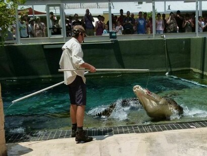 Dopo un paio di giorni in giro per il Litchfield prendiamo la Arnhem Hwy per Jabiru, strada che ci porta dritti ad altre mille visioni da poster. Sulla via, eloquente il cumulo di bottiglie di birra vuote attorno alla tomba di un giovane posta sul ciglio della strada, un'ultima sbornia in memoria dell’amico perito in un incidente. La deviazione alle spalle della collina del Window on the Wetlands, osservatorio sulle terre che verranno sommerse dalle imminenti piogge monsoniche, ci conduce all’Adelaide River da dove partono le escursioni per la jumping crocodile cruise, il modo più sicuro e comodo per vedere i coccodrilli nel loro ambiente naturale. Diventa uno show unico quando il marinaio dal battello allunga una canna con appesa la carne ed enormi coccodrilli balzano fuori dall’acqua per afferrarla con incredibili salti nel vuoto. Tornati sulla via principale, la seconda laterale a sinistra in 20 km di pista d’arenaria color ruggine, che contrasta magnificamente col verde della foresta e l’azzurro del cielo, ci porta al selvaggio capolinea di Corroboree Billabong, un’ansa interna del Mary River riservata alle Houseboat, case galleggianti che le famiglie utilizzano per andare a pescare principalmente grossi barramundi, il pesce simbolo del Top End. Lo spettacolo della natura circostante è garantito: bufali, dingo, cinghiali, colonie di grossi volatili e schiere di canguri e wallaby (marsupiali più piccoli) che saltellano liberi a bordo pista, per nulla intimoriti. Anche qui come altrove rimproverano chi si avvicina troppo alla riva per il reale pericolo di coccodrilli sia d’acqua dolce che salmastra: “Don’t risk your life”. Gli operatori stanno fissando e chiudendo tutto a regola d’arte, oggi è l’ultimo giorno lavorativo, torneranno a maggio. A breve le piogge saranno talmente abbondanti da alzare il livello dell’acqua di 4-5 metri, allagando tutta la regione.
