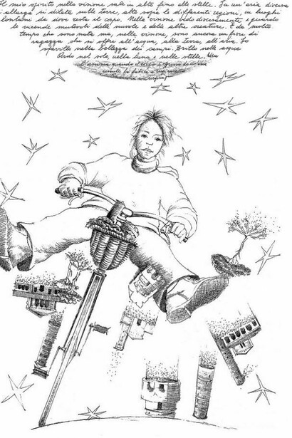 In estate m’incanta il tramonto nella valle. Il cielo e l’acqua e la vegetazione acquistano toni potenti, maestosi, in antitesi alle vedute sfumate del paesaggio ravennate. Sono atmosfere africane. Sono quelle atmosfere extracomunitarie che qui “a casa nostra” ci fanno paura e così insensatamente respingiamo. Sono atmosfere da terzo mondo. Sono trionfi dello sguardo. L’Africa l’ho vista solo nei film e alcuni paesaggi e tramonti erano simili a quelli della mia valle: un paesaggio straniero nella mia terra. Questi sono gli scherzi della visione nella quale Ildegarda mi ricorda che tutte le cose le vedo con gli occhi interiori del mio spirito. Ma sono sveglia con tutto il corpo e la mente. Quando guardo, ogni tristezza e ogni angoscia scompare. Ritorno lungo l’argine del fiume. In realtà due sono le mie strade: quella invernale percorre l’argine del fiume e quella estiva va al mare. Percorro le due strade con la stessa bicicletta. Lei - la bicicletta - è il mio docile destriero. A volte ho l’impressione di andare a cavallo. Certo. A cavallo della mia bicicletta. Che è una bicicletta apparentemente “comune”. In realtà è una creatura di antica saggezza. È la mia casa ambulante con due tasche laterali, con cestino, e a volte, il seggiolino per condividere un tratto di cammino con Natalia o Federico. È anche capace di inaudite metamorfosi. Si fa pulmino quando devo distribuire sporte di cibo; diventa un’efficiente bicicletta quando mi conduce nelle “mie” strade. Ugualmente mi sorpassano tutti, ma io ho le ossa fragili e non devo correre, non devo cadere. E lei, in effetti, è un po’ più lenta e pesante di una normale bicicletta. A volte più vicina al trattore che a una scattante bicicletta. Ma è lei che tutte le mattine, alle 11, decide dove, per me, è ancora possibile andare. Ildegarda vola alta. Non la vedo, ma sento le sue parole. Con due ruote, manubrio, sellino, pedali tra di loro uniti da congegni geniali, la mia bicicletta è invece la personificazione della concretezza e per sublime coerenza mi conduce verso la libertà in tempi e spazi certi.