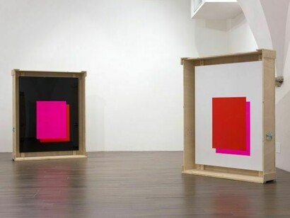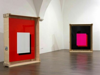 Il gioco di Gerold Miller con le possibilitá di combinazioni dei colori e la riduzione formale genera superfici connotate da una forte presenza.